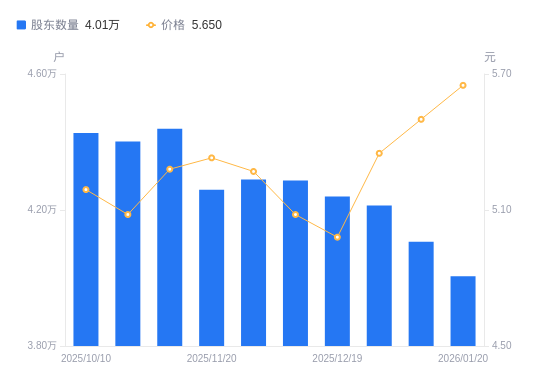 日期A股户数(户)流通A股户均持股数(股)户均持股市值(万元)2026-01-204005239934.1522.562026-01-094106638948.1021.422025-12-314213637959.0520.312025-12-194239437728.0418.792025-12-104286837310.8718.952025-11-284289637286.5219.652025-11-204259237552.6520.022025-11-104438936032.4119.032025-10-314401236341.0618.462025-10-104426836130.9018.75